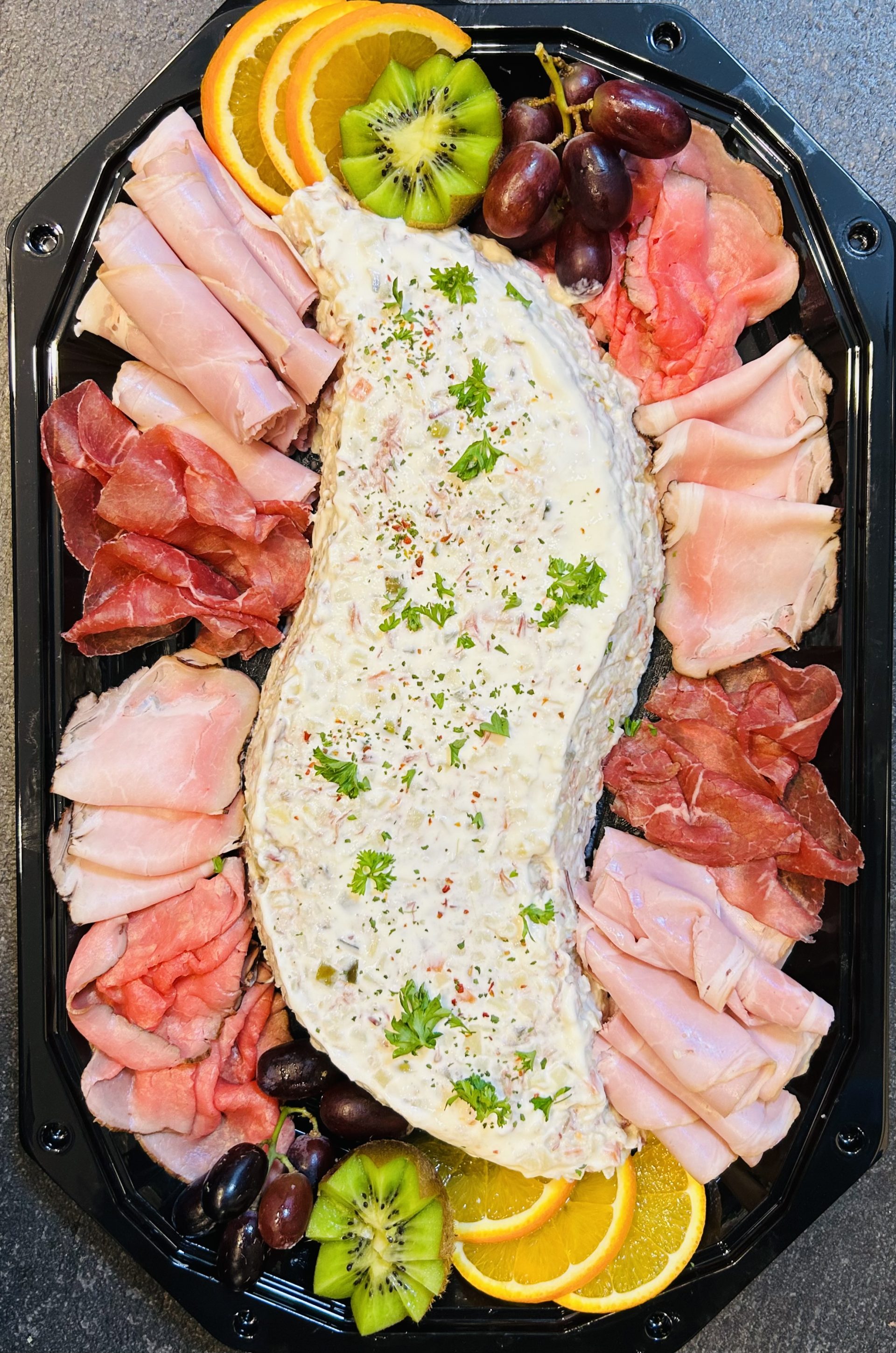 DEZE SCHAAL BESTAAT UIT ONZE HUISGEMAAKTE RUNDVLEESSALADE, MET DAAROMHEEN EEN SELECTIE VAN ONZE LEKKERSTE HUISGEMAAKTE VLEESWAREN