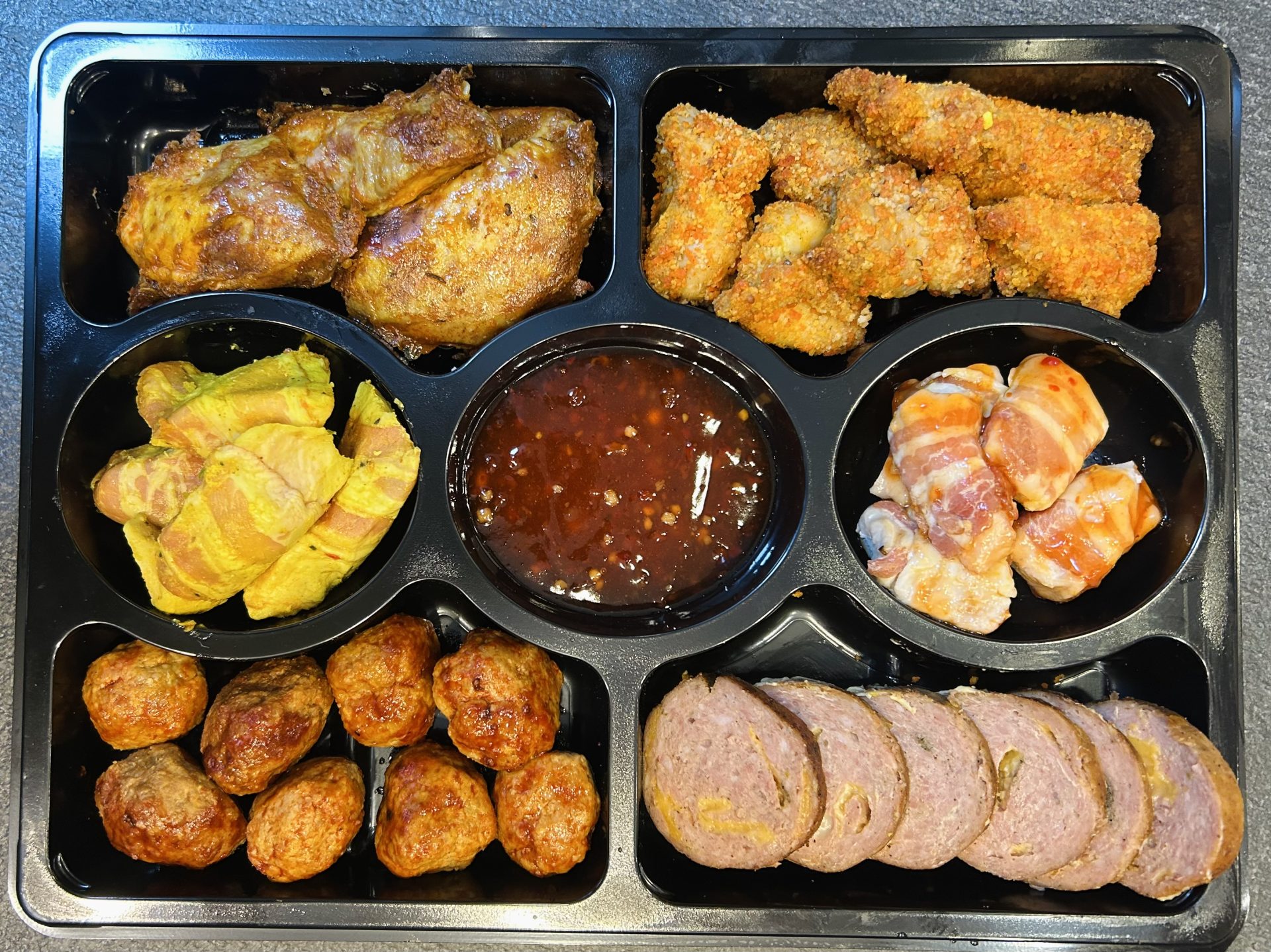 Zoals: mini gehaktballetjes, mini kipkerrie rolletjes, mini kipbacon rolletjes, gegaarde kipkluifjes, kippeling, plakjes grillworst en met gratis piri piri saus