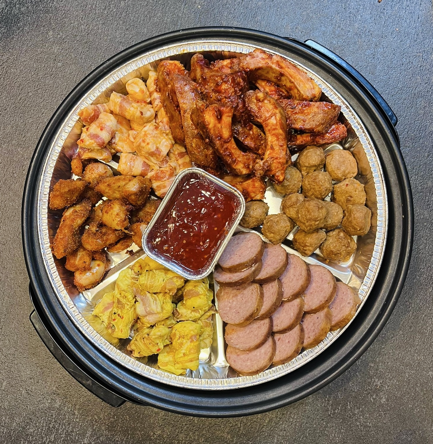 De snacks bestaan uit mini gehaktballatjes, mini kip op stok, mini kipbacon, kippeling, spareribs en plakjes grillworst